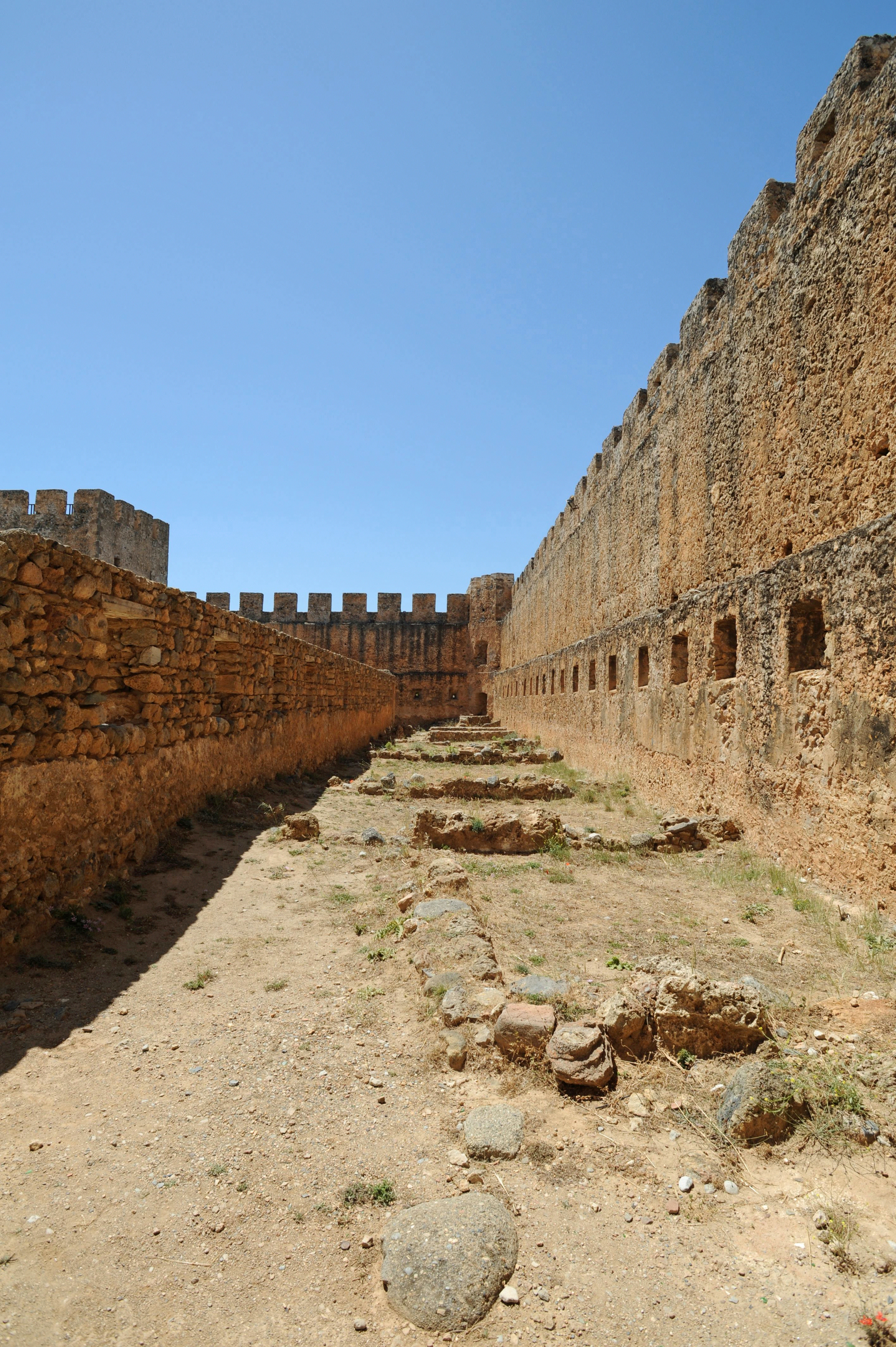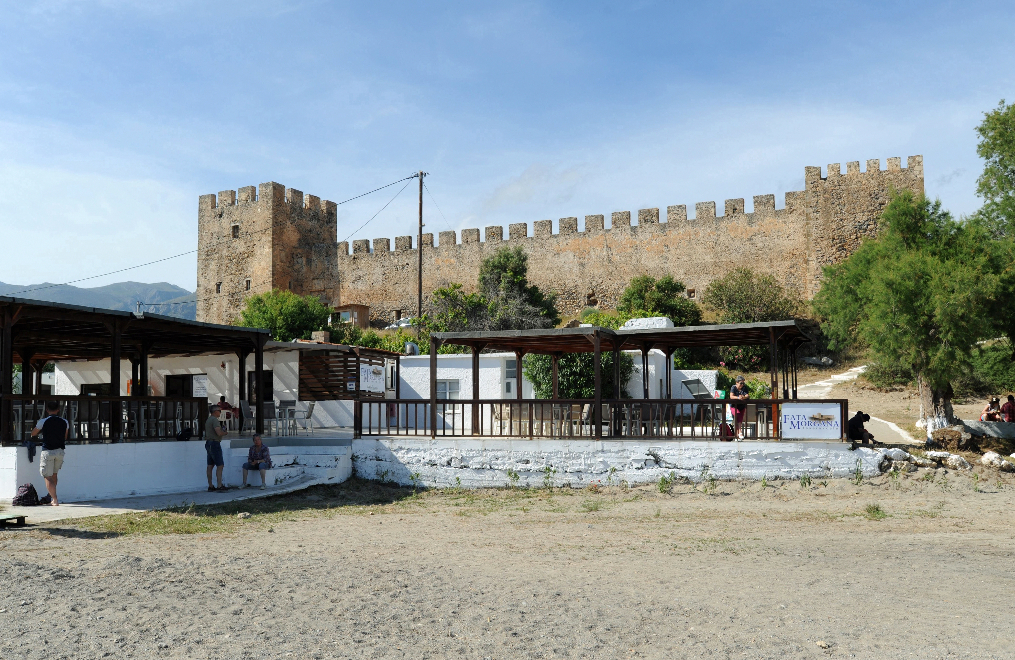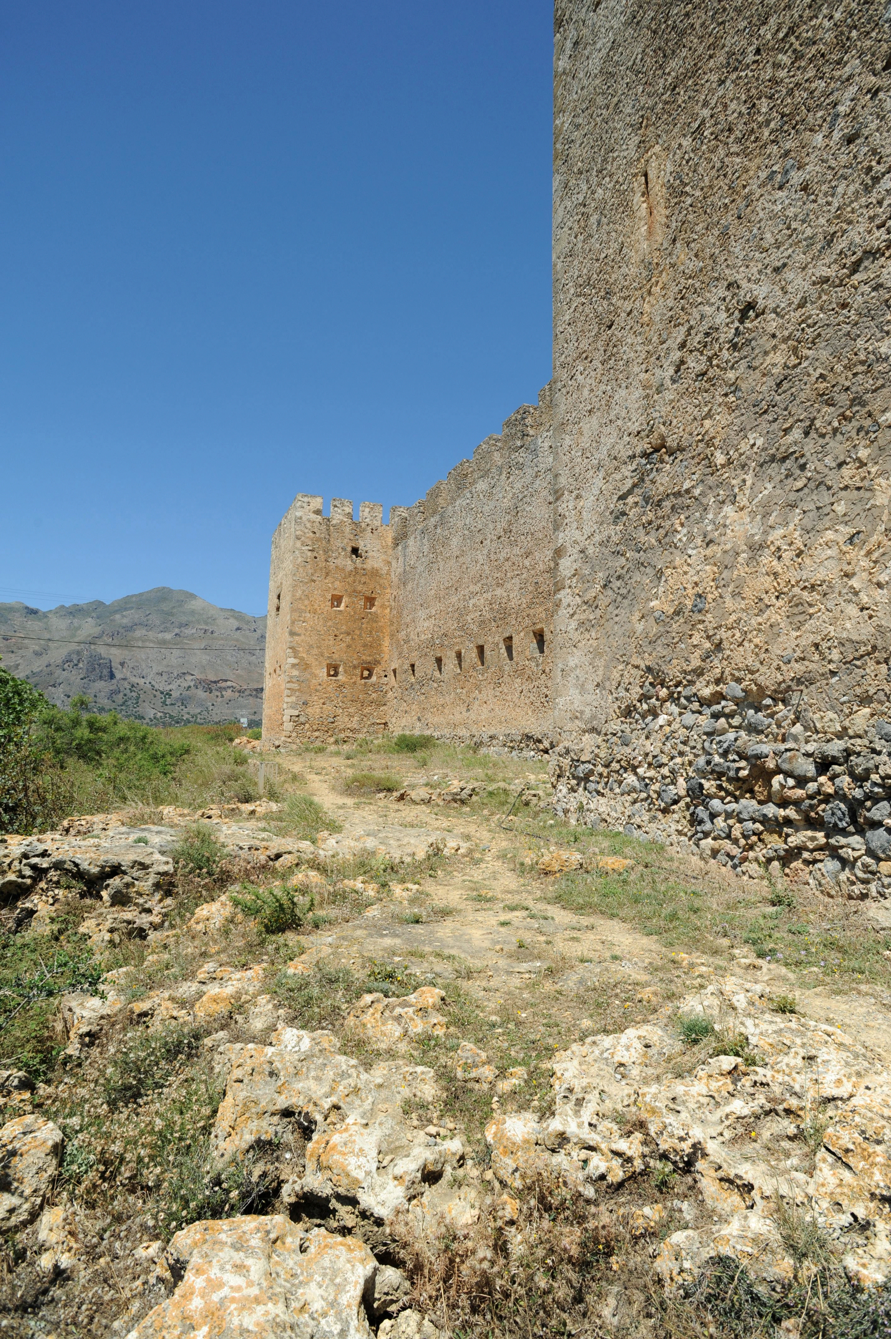 | Le château de Frangokastello (Φρούριο Φραγκοκάστελλο / Froúrio Frangokástello) | Le château de Frangokastello est un château fort médiéval du XIVe siècle, édifié par les Vénitiens dans le coin sud-est de la contrée des Sfakia, à environ 15 km à l’est du village de Chora Sfakion, le chef-lieu des Sfakia.Le nom de Frangokastello, ou Frangokastélo, est le nom que la population sfakiote donnait à ce château vénitien ; le nom signifie « château franc » ou « château des Francs », car les Grecs, entre autres les Crétois, assimilaient les Vénitiens, catholiques de rite romain, aux Francs (Φράγκοι / Fránkoi), également catholiques de rite romain, qui avaient pris Constantinople et disloqué l’Empire byzantin lors de la IVe croisade en 1203, croisade dont faisait partie la République de Venise. Le nom d’origine du château était en réalité Castel di San Nichita (καστέλο του Αγίου Νικήτα), le « château Saint-Nicétas », du nom de la cité et de la basilique byzantine d’Agios Nikitas (Άγιος Νικήτας) voisines du château, situées à environ 350 m à l’est. Les Vénitiens finirent par adopter le nom grec et nommèrent le château « Castel Franco » ou « Castelfranco », un nom similaire mais qui évoque un toponyme fréquent en Italie, Castelfranco, qui signifie « château libre », notamment libre d’impôts. C’est le nom local qui a subsisté : de nos jours, le château est nommé Frangokastello. C’est dès le début de l’année 1340 que les seigneurs de la province de Canea – notamment les Skordylis qui contrôlaient la région des Sfakia – envoyèrent à Venise un émissaire, Tomaso Vizzamano, pour demander, entre autres choses, la construction d’un château près de la basilique d’Agios Nikitas. Le Sénat de la République Sérénissime refusa tout soutien financier à cette construction, jugeant cette construction totalement inutile dans cette région isolée ; deux ans plus tard les seigneurs réitérèrent leur demande et reçurent le même refus. Cependant, le 10 février 1371, face aux demandes répétées des seigneurs, le Sénat décida de construire le château et, si nécessaire, avec des fonds publics. Le Castel San Nichita fut édifié entre les années 1371 et 1374 ; son achèvement fut longtemps retardé, les habitants du pays voyant d’un mauvais œil une telle réalisation : des troupes protégeaient les ouvriers toute la journée et ceux-ci passaient la nuit sur leurs navires en mer ; mais, selon la tradition locale, les Sfakiotes, accompagnés de leurs chefs, les six frères de la famille Patsos (Πατσός), détruisaient pendant la nuit ce que les Vénitiens construisaient pendant la journée ; les Vénitiens capturèrent les six frères Patsos, qui furent pendus aux tours et à l’entrée du château, et réussirent à achever la construction du château.