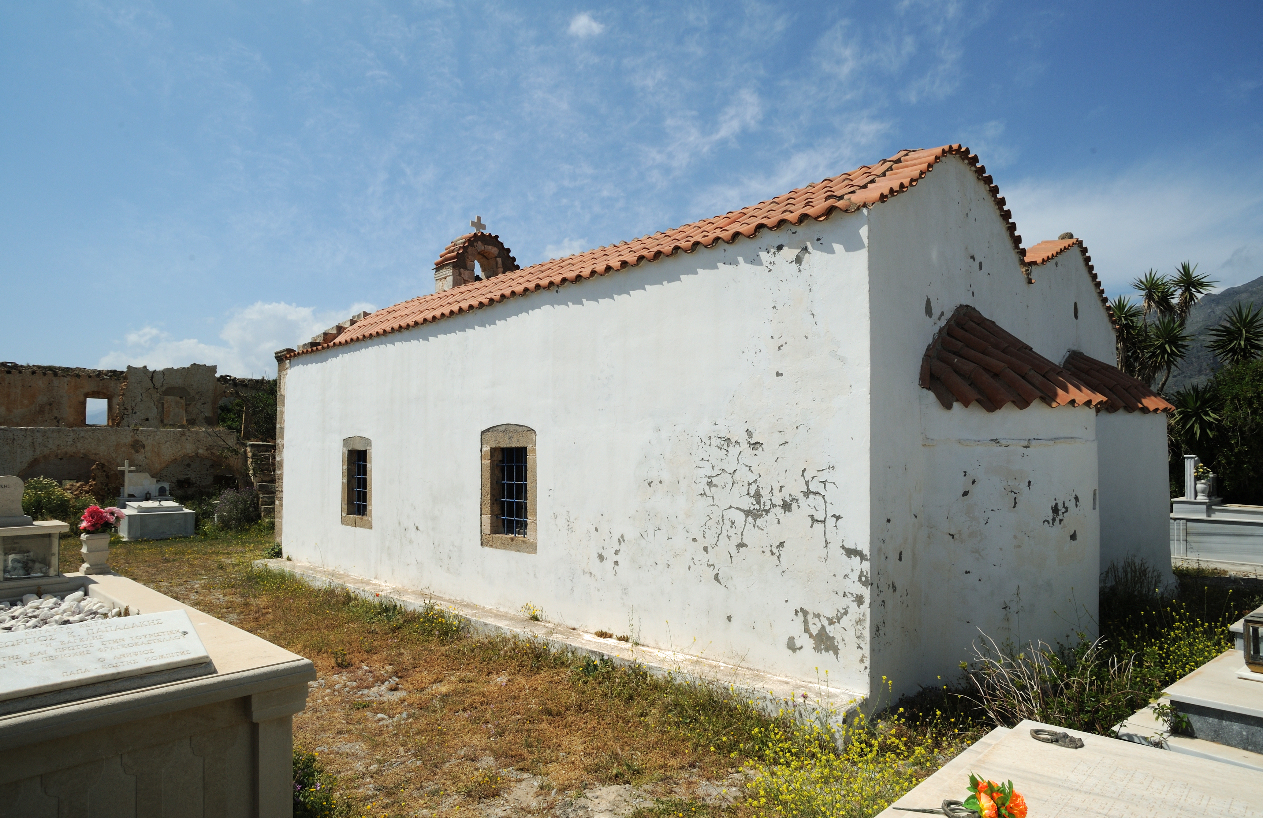L’ancienne église d’Agios Nikitas était une basilique édifiée dans la seconde moitié du VIe siècle, à une époque où la côte sud-ouest de la Crète était florissante. La basilique Saint-Nicétas mesurait environ 26 m de longueur dans la direction ouest - est, et 9 m de largeur du sud au nord ; elle comprenait trois nefs et était couverte par une toiture en bois ; son plancher était couvert d’une mosaïque. La nef centrale était séparée des deux nefs latérales par des colonnades ; de part et d’autre du sanctuaire se trouvaient des « pastophoria » (παστοφόρια, singulier παστοφόριο), c’est-à-dire des sortes de sacristies par lesquelles on pouvait passer de la nef centrale à une nef latérale ; on peut encore voir des vestiges du « pastophorio » du nord ; à l’ouest des nefs se trouvait un narthex intérieur ; à l’est se trouvait une abside semi-circulaire. Les planchers de la basilique d’Agios Nikitas étaient couverts de mosaïques présentant des décorations géométriques, losanges, méandres, cercles et demi-cercles, carrés inscrits dans un cercle et cetera, et des représentations végétales et animales, comme celle d’une chèvre noire en train de paître entre des rameaux, dans la nef du nord ; on peut voir une partie de ces mosaïques, en plutôt bon état, dans la petite église présente ; une partie des mosaïques des autres nefs, qui se trouvaient à l’extérieur de l’église présente, ont été transférées au Musée archéologique ; seules les mosaïques de la partie orientale de la nef du sud et du sanctuaire ont été détruites. Les motifs du sol de la basilique d’Agios Nikitas formaient un ensemble intéressant, différent des mosaïques crétoises traditionnelles, sans toutefois s’écarter stylistiquement des œuvres provinciales du milieu du VIe siècle. Il semble que la basilique Saint-Nicétas et la cité voisine commencèrent de décliner vers le milieu du VIIe siècle, à cause de la multiplication des incursions de pirates sarrazins ; la basilique fut abandonnée et détruite pendant l’occupation sarrazine de la Crète au IXe siècle et au Xe siècle ; cependant, les fondations de ses murs sont encore visibles sur une profondeur considérable sous la surface du sol. Il fallut attendre le XIIIe siècle pour que la contrée connaisse un renouveau ; sous la domination vénitienne, plusieurs petites églises orthodoxes furent construites sur les ruines des anciennes basiliques, souvent à l’emplacement du sanctuaire de ces basiliques. La petite église Saint-Nicétas (εκκλησάκι του Αγίου Νικήτα) présente a été édifiée sur le côté oriental de la nef centrale de l’ancienne basilique ; c’est une église à nef unique, d’environ 7 m de longueur. À l’intérieur, on trouve des traces de fresques, en mauvais état et en partie recouvertes de plâtre, datant du XIVe siècle : l’ « Ascension », la « Dormition de la Vierge » et les « Hiérarques concélébrant ». Des matériaux et des éléments architecturaux de l’ancienne basilique ont été remployés pour la construction de l’église, notamment deux colonnes encastrées dans les murs latéraux de l’église. Au siècle suivant, vers la fin du XIVe siècle, des matériaux de la basilique furent aussi remployés pour la construction du château Saint-Nicétas. Il y avait, dans la région de Frangokastello, une autre basilique datant de la première époque byzantine, dans la seconde moitié du VIe siècle, située à environ 1,5 km au nord-ouest du château, la basilique Saint-Astratigos (βασιλική του Αγίου Αστράτηγου). Le nom de cette basilique, Saint-Astratigos (Άγιος Αστράτηγος), semble être une déformation de Saint-Eustrate de Nicée (Άγιος Ευστράτιος ο Νικαίας). La basilique Saint-Eustrate subit le même sort que la basilique Saint-Nicétas : elle fut détruite sous l’occupation arabe et une petite église orthodoxe fut construite sur ses ruines à l’époque vénitienne, au moyen de matériaux provenant de l’ancienne basilique. L’église Saint-Eustrate est, de nos jours, presque totalement ruinée. |