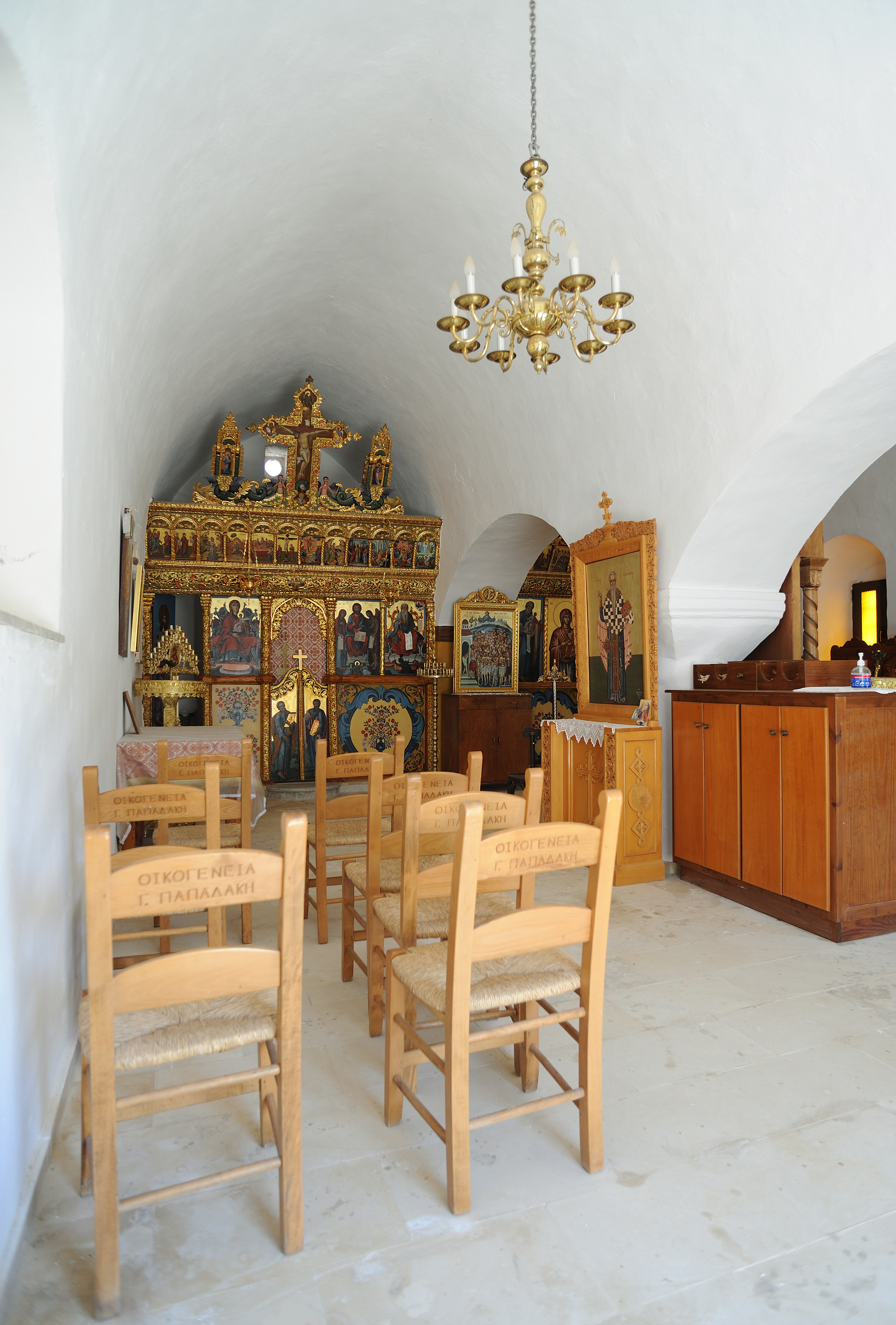 | L’église Saint-Charalampe (Άγιος Χαράλαμπος / Ágios Charálampos) | L’église Saint-Charalampe était le catholicon d’un ancien monastère (μονή του Αγίου Χαραλάμπους) situé à environ 350 m à l’est du château de Frangokastello, sur un petit promontoire rocheux situé entre la plage de Frangokastello et la plage d’Orthi Ammos (Ορθή Άμμος). Aller à l’église Saint-Charalampe avec Google Maps (35.181439, 24.240190). L’église est dédiée à saint Charalampe (Άγιος Χαράλαμπος), évêque de Magnésie du Méandre en Asie Mineure, un saint du IIe siècle, mort martyr des persécutions antichrétiennes de Septime Sévère au début du IIIe siècle, vers l’an 202 ; saint Charalampe est fêté le 10 février. Un ancien monastère, avec une petite église dédiée à Agios Charalampos, semble avoir existé à cet emplacement avant la création d’un nouveau monastère en 1821 ; la tradition dit que ce nouveau monastère Saint-Charalampe fut créé par deux religieux, le moine Grégoire (Γρηγόριος) et la sœur Madeleine (Μαγδαληνή), lorsqu’ils s’installèrent dans la contrée. Le monastère fut restauré et agrandi par des bâtiments monastiques de deux planchers situés à l’ouest de l’église, et aussi fortifié, en cette époque troublée ; on peut remarquer les meurtrières percées dans le bâtiment monastique qui subsiste de nos jours ; le monastère acquit des terres qui sont, de nos jours, occupées, de façon plutôt incongrue, par un terrain de jeu de podosphère. La légende raconte que, en mai 1828, après la bataille de Frangokastello entre les Grecs et les Turcs, sœur Magdalini trouva le corps sans vie et la tête du chef des combattants grecs, Chatzimichalis Dalianis (Χατζημιχάλης Νταλιάνης), et les enterra dans le cimetière du monastère. L’église du monastère fut agrandie, avec l’ajout d’une nef supplémentaire du côté nord, une nef dédiée à saint Jean le Théologien (Άγιος Ιωάννης ο Θεολόγος) ; un peu plus tard, les deux nefs furent prolongées vers l’ouest ; pour la façade de l’église, des éléments architecturaux en marbre de la basilique Saint-Astratigos furent utilisés. Selon des historiens de l’art, l’église Saint-Charalampe présente une grande similitude avec le catholicon du monastère de Prévéli, situé à une vingtaine de kilomètres à l’est, et également dédié à saint Jean le Théologien ; l’église Saint-Charalampe aurait été agrandie par le même bâtisseur. | _small.jpg) _small.jpg) _small.jpg) | À l’intérieur de l’église Saint-Charalampe on peut admirer une iconostase intéressante en bois sculpté, mais dont certaines icônes ont été volées. | _small.jpg) _small.jpg) _small.jpg) _small.jpg) _small.jpg) |