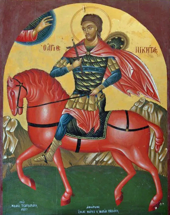 | L’église Saint-Nicétas (Άγιος Νικήτας / Ágios Nikítas) | L’église Saint-Nicétas à Frangokastello (Άγιος Νικήτας στο Φραγκοκάστελο) se trouve à environ 400 m à l’est-nord-est du château de Frangokastello ; le nom d’origine du château vénitien était d’ailleurs Castel di San Nichita (« château Saint-Nicétas »). Aller à l’église d’Agios Nikitas avec Google Maps (35.183561, 24.238077). L’église a repris le nom d’une ancienne basilique, datant du début de la première époque byzantine, située à cet emplacement, la basilique Saint-Nicétas (βασιλική του Αγίου Νικήτα). L’église Saint-Nicétas est dédiée à saint Nicétas le Goth (Άγιος Νικήτας ο Γότθος), un saint du IVe siècle après JC, fêté le 15 septembre par les églises catholiques et les églises orthodoxes ; à ne pas confondre avec saint Nicétas de Novgorod (Новгородский Никита), un saint orthodoxe du XIIe siècle.