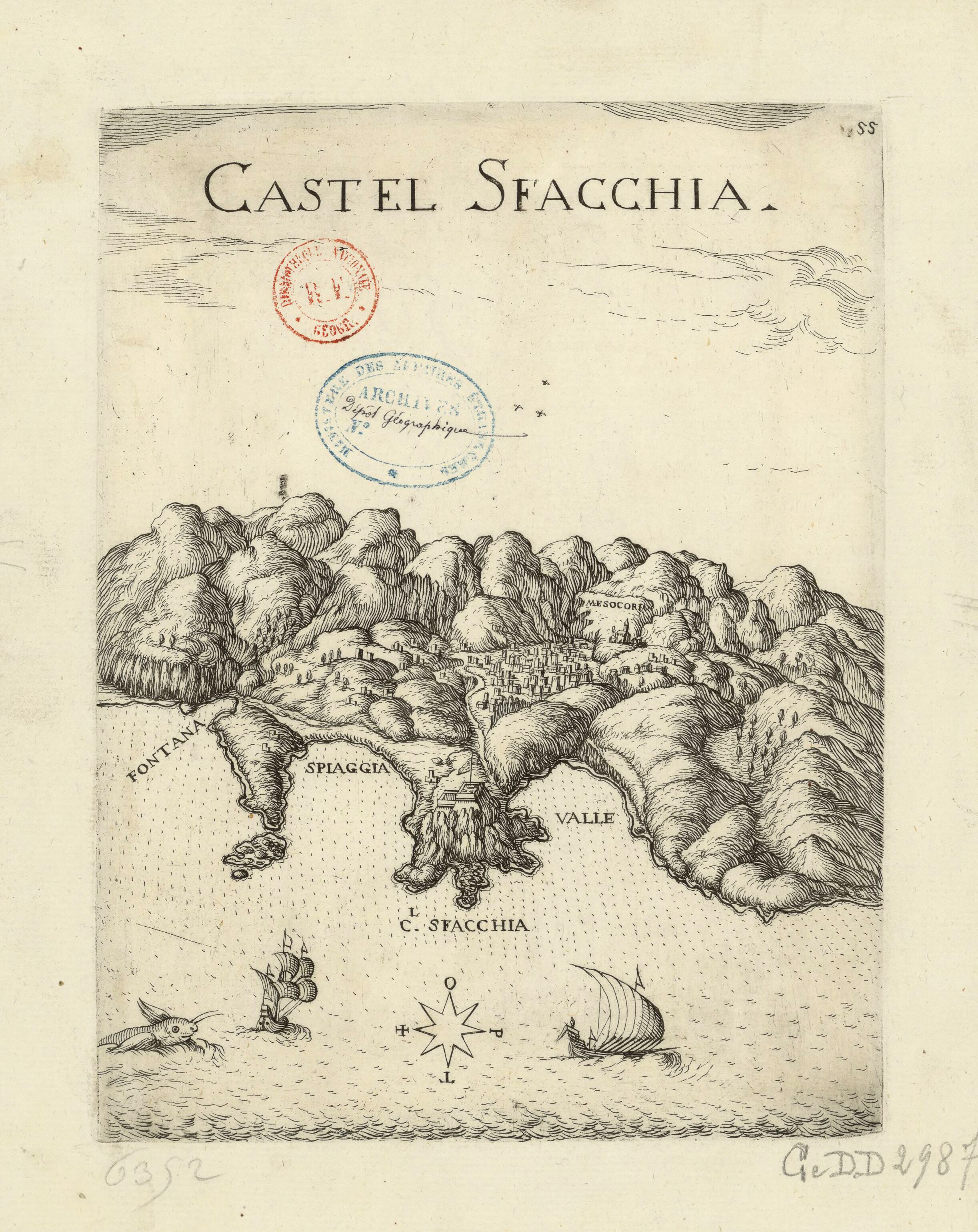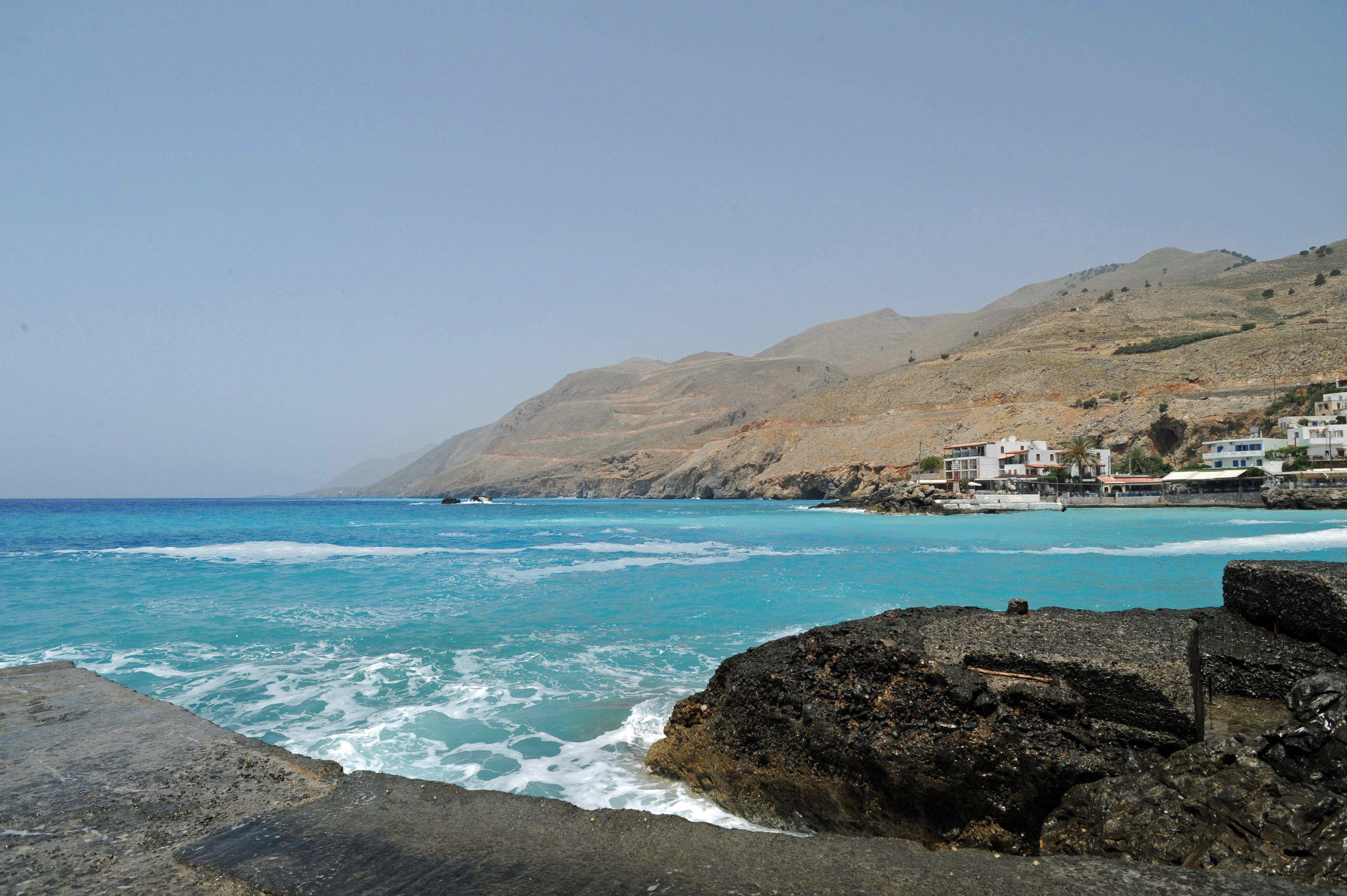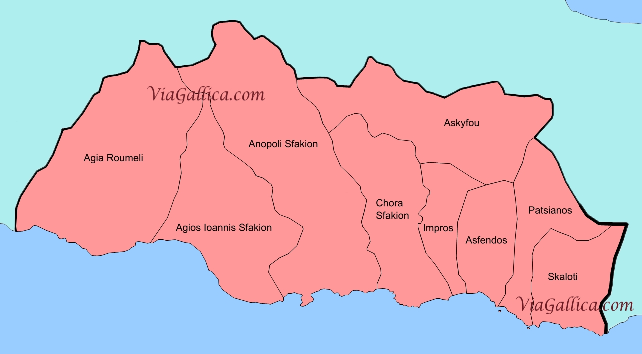 | La ville de Chora Sfakion (Χώρα Σφακίων / Chóra Sfakíon) | Chora Sfakion est une petite ville portuaire de la côte sud de la Crète, dans la province de La Canée. Chora Sfakion se trouve à environ 70 km au sud-sud-est de la ville de La Canée, le chef-lieu de la province, par la route nationale 90, puis, à partir de Vryssès (Βρύσες), par la route provinciale 54, soit environ 1 h 30 min de conduite. Chora Sfakion se trouve à la même distance, 70 km, à l’ouest-sud-ouest du chef-lieu de la province de Réthymnon, la ville de Réthymnon. Plusieurs autocars relient quotidiennement La Canée et Chora Sfakion. Vers l’est, une bonne route conduit à Frangokastello, à Rodakino, à Sellia et au port de Plakias, à 40 km de Chora Sfakion. Vers l’ouest il existe une petite route sinueuse, éloignée de la côte, qui conduit à Anopolis, à Aradaina et à Agios Ioannis. Le village de Chora Sfakion se trouve dans une région particulièrement inaccessible et accidentée, entourée par les pentes escarpées des Montagnes Blanches, qui plongent dans la mer de Libye, et les nombreuses gorges qui les sillonnent ; le village est à la sortie des gorges dénommées gorges de Sfakia, ou « gorges sfakiennes » (Σφακιανό φαράγγι) ; ces gorges sont situées à environ 2,5 km à l’ouest des célèbres gorges d’Imbros. Jusqu’après la Seconde Guerre mondiale, les gorges d’Imbros étaient la seule voie d’accès à Chora Sfakion ; plus tard, une route à revêtement a été construite entre les « gorges imbriotiques » (Ιμβριώτικο φάραγγι) et les gorges d’Imbros, permettant l’accès en voiture automobile depuis La Canée à Chora Sfakion.