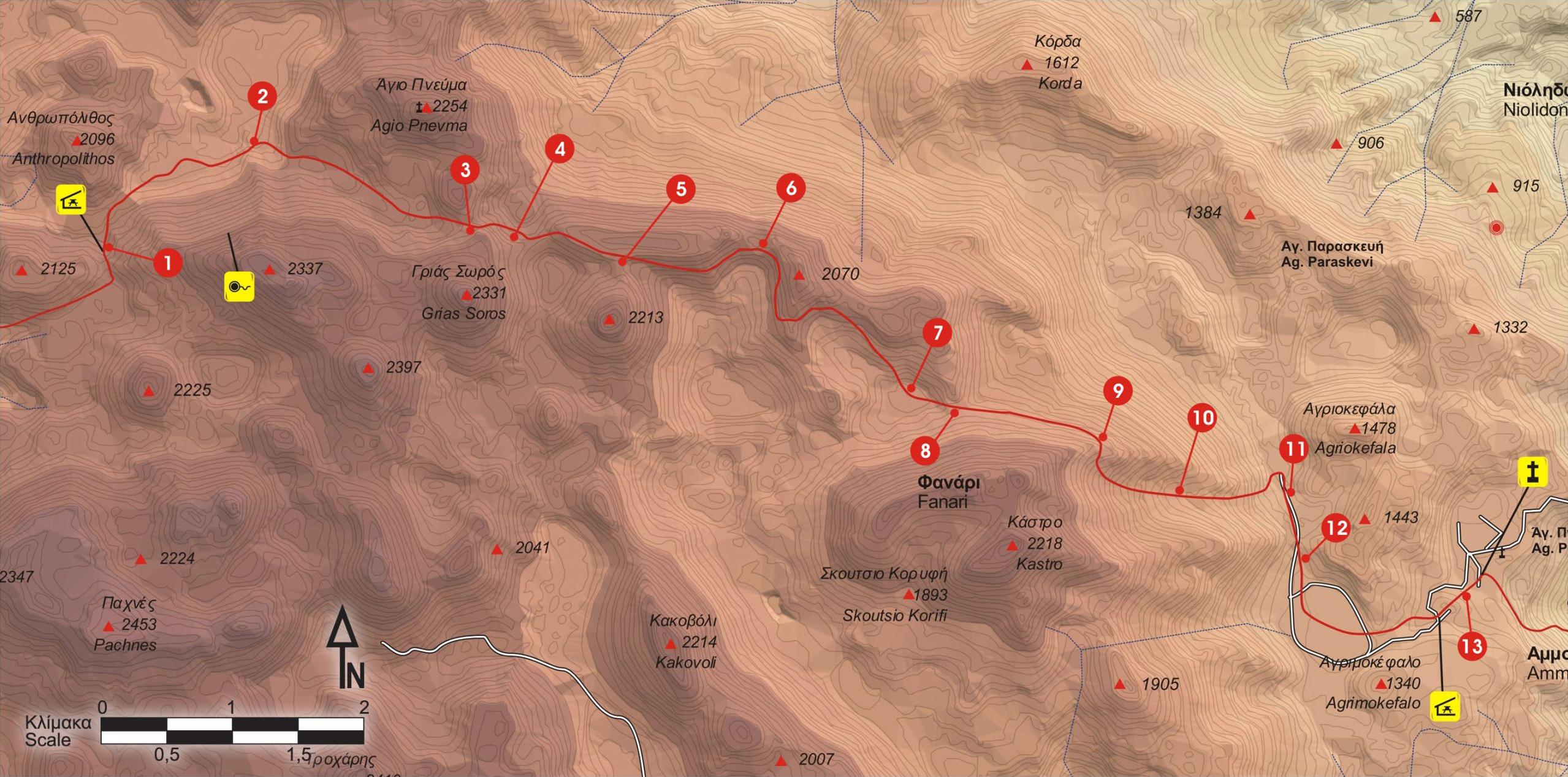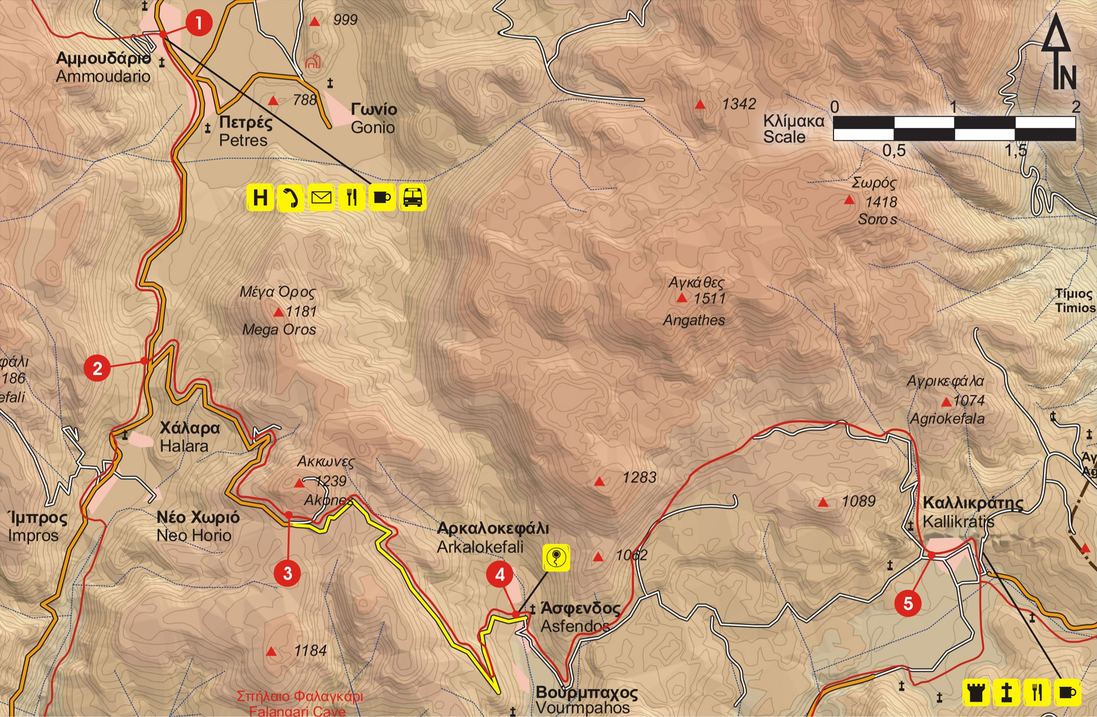 Un peu avant Imbros, à Chalara (Χάλαρα), une autre branche du chemin E4, la section 24, part vers l’est en direction d’Asfendos, de Kallikratis et d’Asi Gonia.