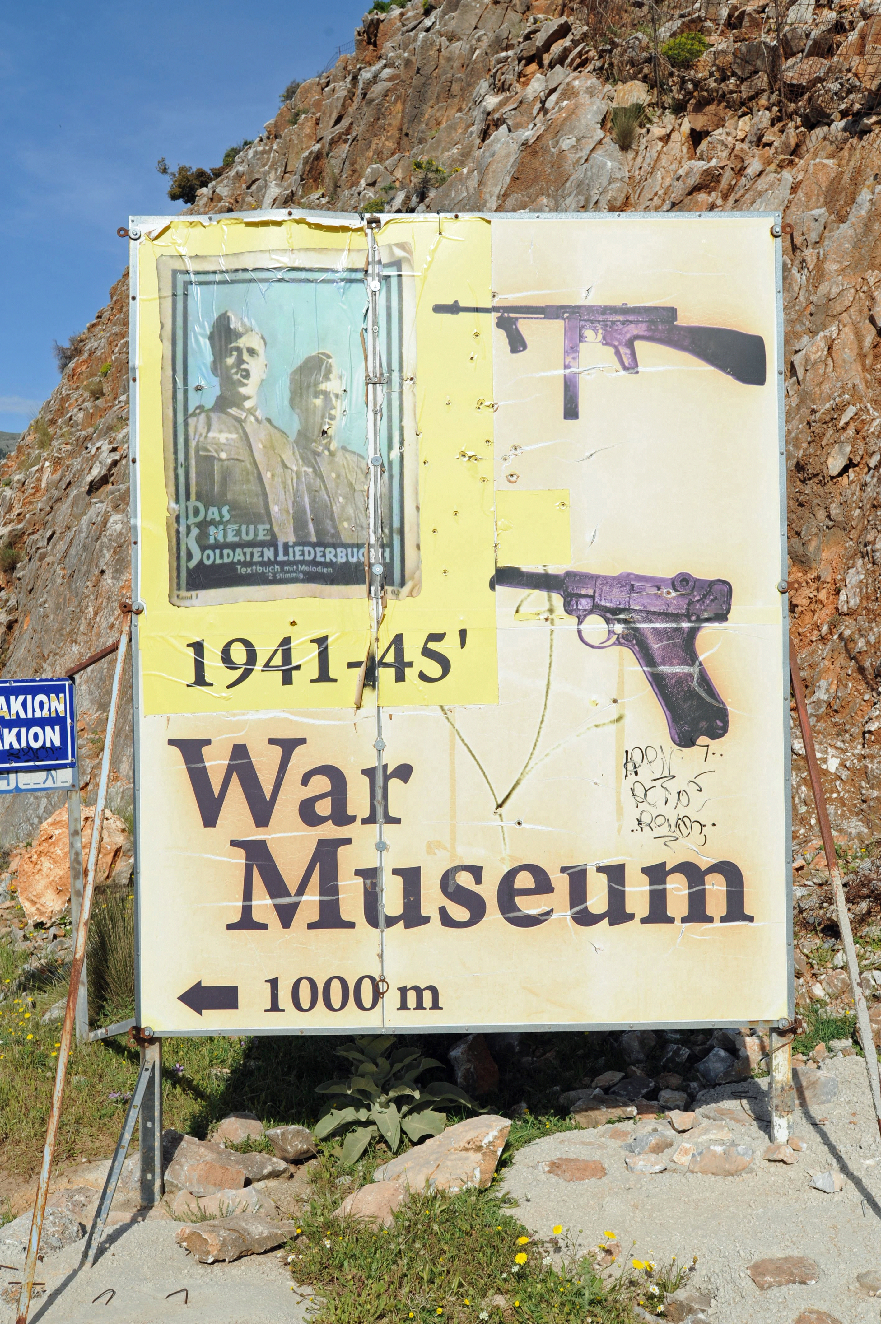 | Le village de Karès (Καρές / Karés) | Le village de Karès est le village situé le plus au nord du plateau d’Askyfou ; en venant du nord, depuis Vryssès, par la route provinciale 54, on atteint un col au lieu-dit Xylodéma (Ξυλόδεμα), à environ 800 m d’altitude, d’où l’on a la meilleure vue sur le plateau d’Askyfou. Peu après ce col on peut bifurquer à gauche sur une petite route secondaire qui descend en lacets vers le village de Karès, situé à environ 700 m d’altitude. Aller au village de Karès avec Google Maps (35.296560, 24.185906). Dans le sud du village de Karès se trouve un petit musée privé, dénommé « Musée de la guerre » (Πολεμικό Μουσείο / Polemikó Mouseío) ; ce musée est annoncé par une multitude de panneaux de direction sur la route provinciale et on ne peut pas le manquer.