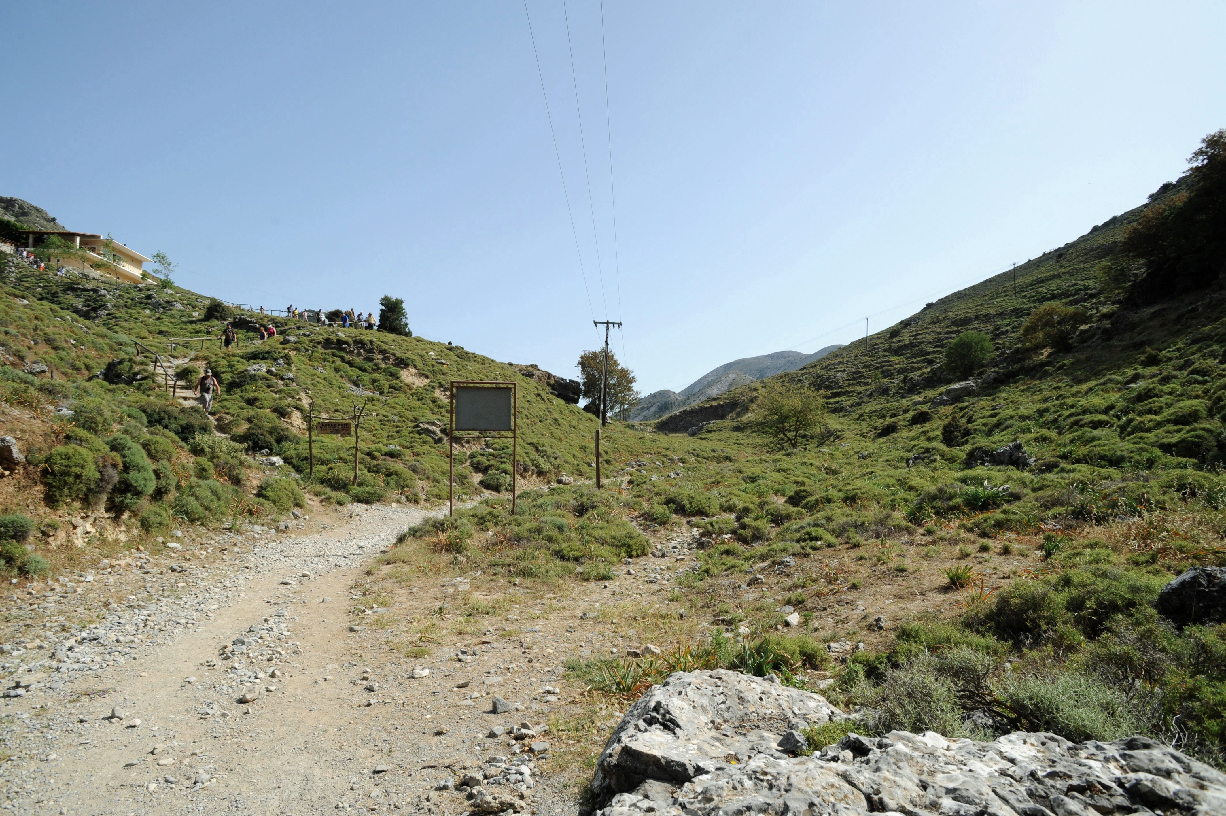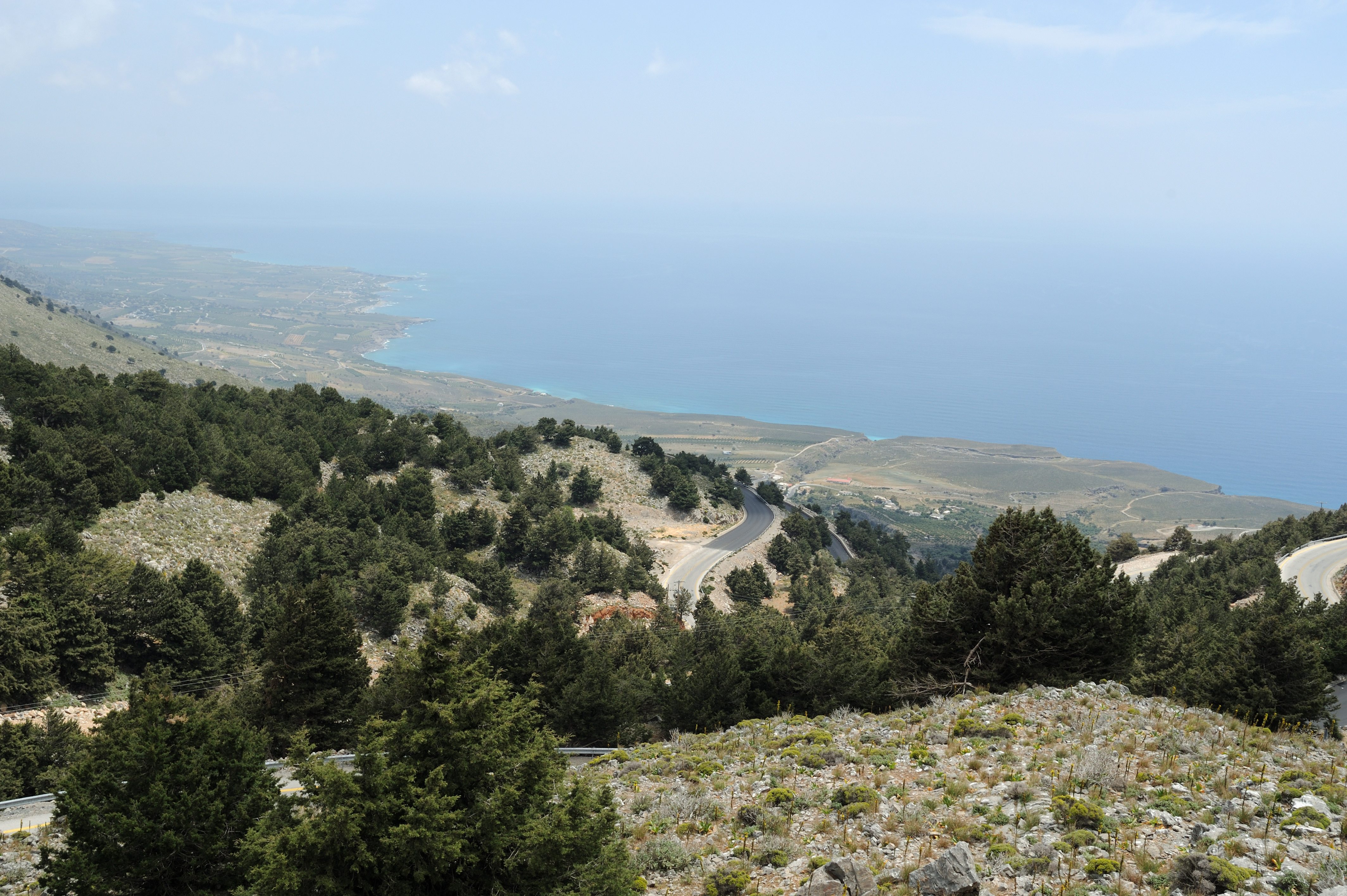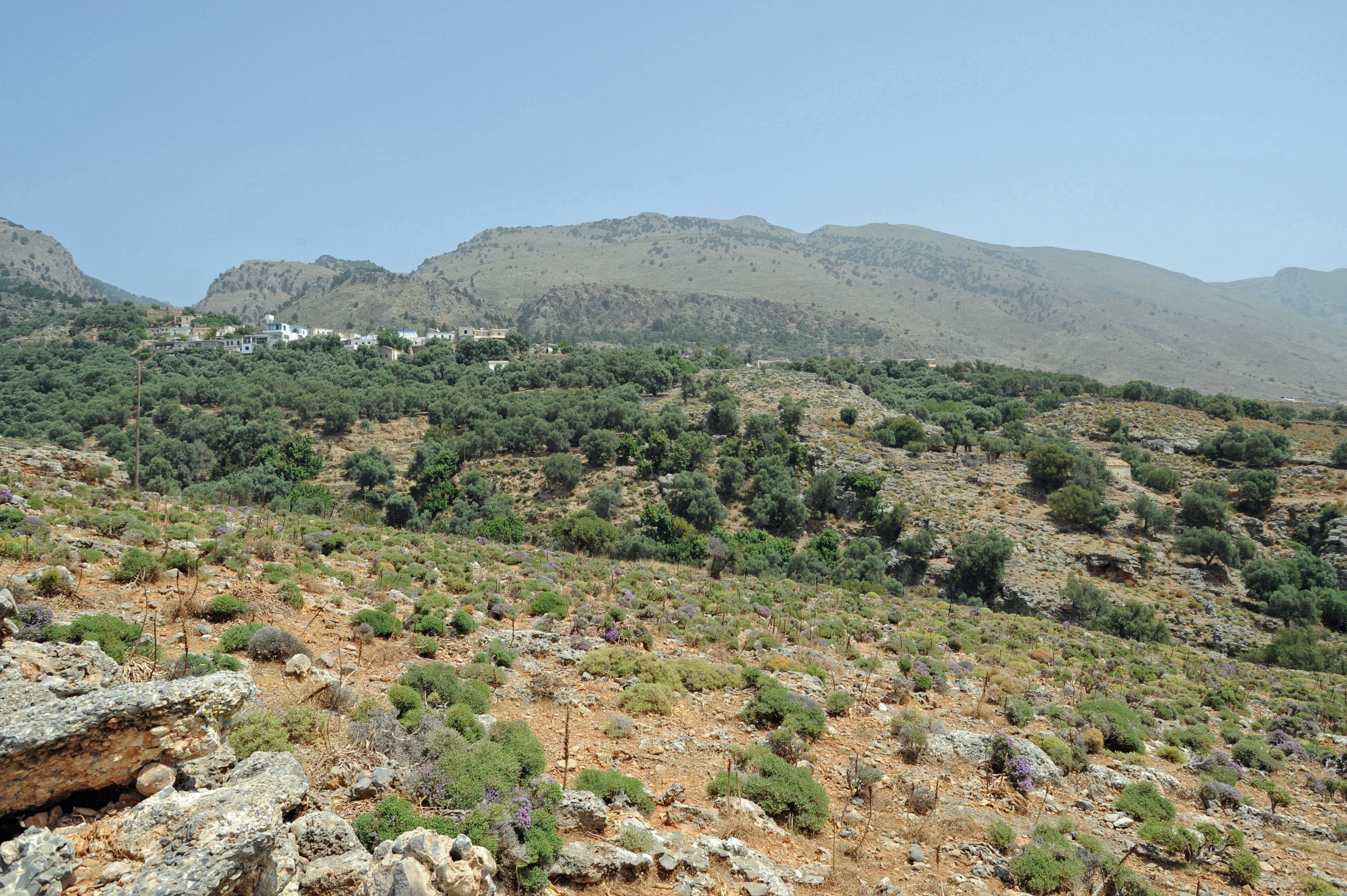 Sur la route de Vryssès à Chora Sfakion | De nos jours on peut facilement accéder aux Sfakia et à Chora Sfakion depuis le côte nord de l’île ; que l’on vienne de La Canée ou de Réthymnon par la route nationale 90, on peut bifurquer vers la route provinciale 54 reliant Vryssès à Chora Sfakion (Επαρχιακη Οδός Βρυσών – Χώρα Σφακίων) ; à environ 2 km au sud-est de Vryssès se trouve un échangeur routier avec une bretelle de sortie vers la route provinciale 54 ; si l’on voyage par l’ancienne route nationale 90, une bifurcation se trouve dans le même secteur. La route provinciale 54 est une bonne route qui se dirige presque plein sud, mais avec de nombreux virages, vers Chora Sfakion qui est, à peu près, à la même longitude que Vryssès, mais de l’autre côté des Montagnes Blanches ; le trajet depuis Vryssès est long de 37 km, soit environ 50 min de conduite, et environ 73 km depuis La Canée, soit 1 h 30 min de conduite. La route provinciale traverse d’abord la plaine de l’Apokoronas, à une cinquantaine de mètres d’altitude, puis elle escalade le versant nord du massif des Montagnes Blanches, jusqu’au plateau de Krapi (οροπέδιο της Κράπης). Après le plateau de Krapi, la route contourne, par l’est, un long promontoire qui marque la bordure entre le dème de l’Apokoronas et le dème des Sfakia, à 580 m d’altitude. La route provinciale continue de monter jusqu’à un col, situé au lieu-dit Xylodema (Ξυλόδεμα), un des deux points culminants de la route, à environ 800 m d’altitude, qui offre une magnifique vue sur le plateau d’Askyfou, qui se trouve en contrebas, à environ 730 m d’altitude.
