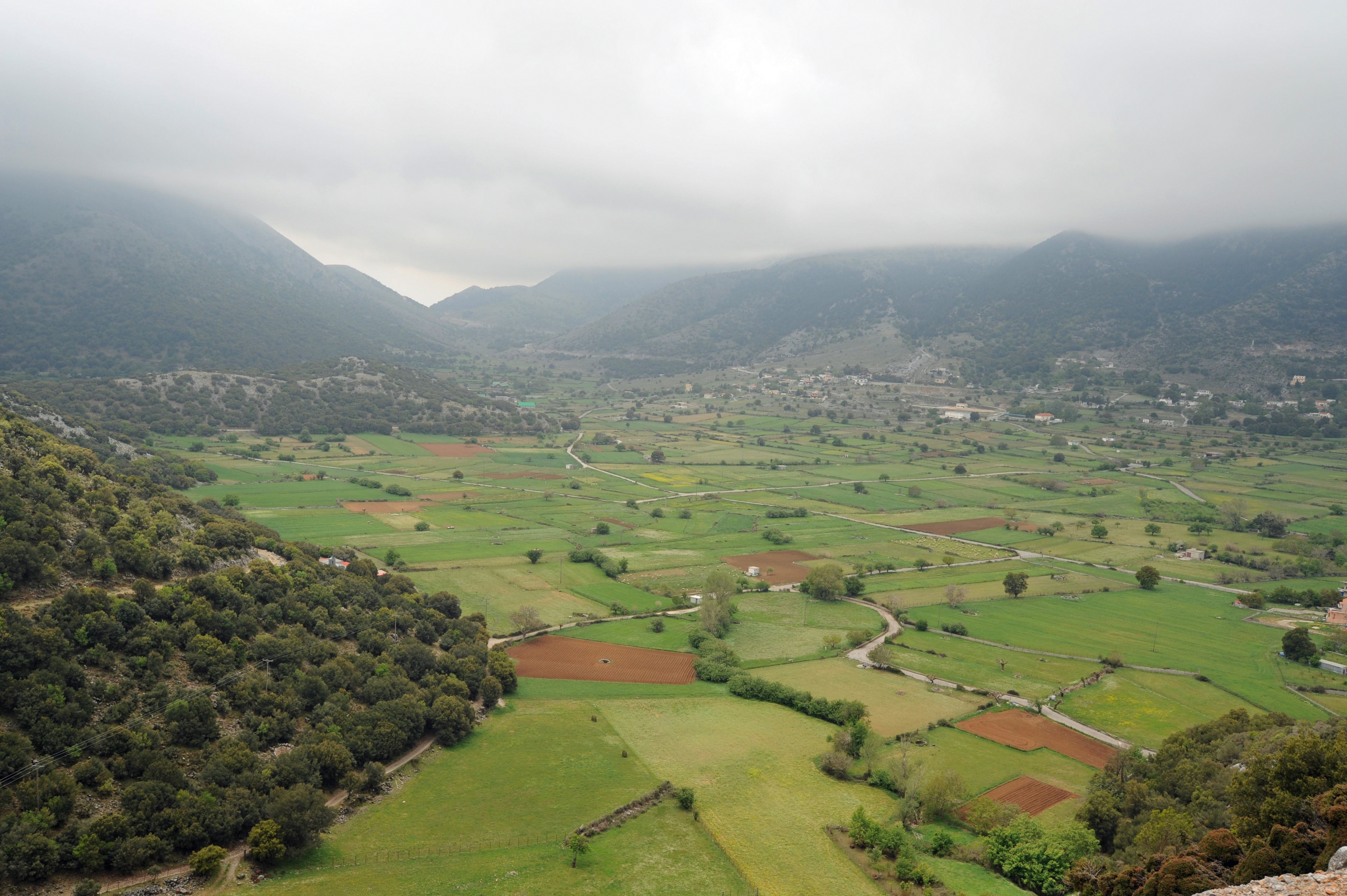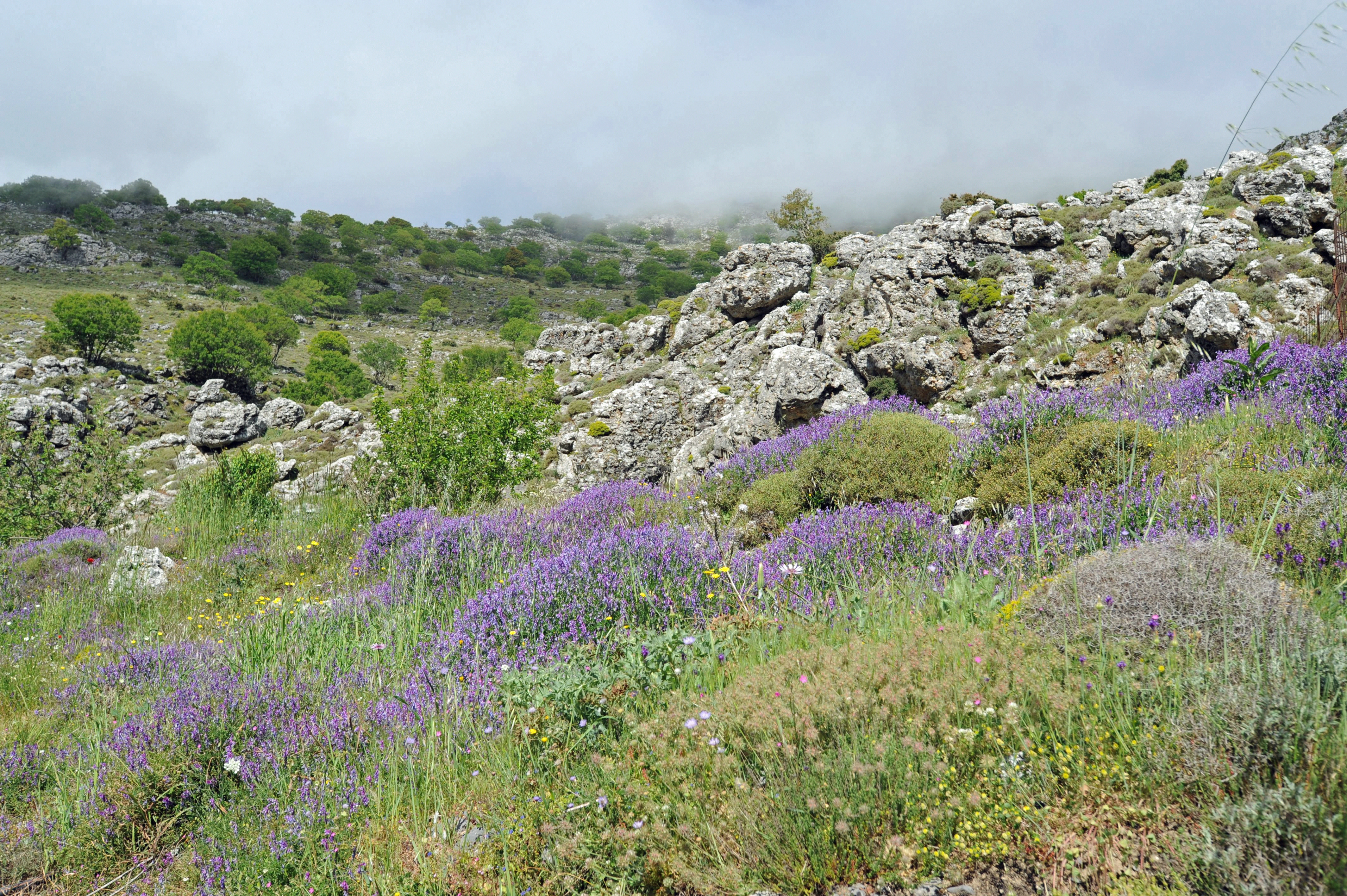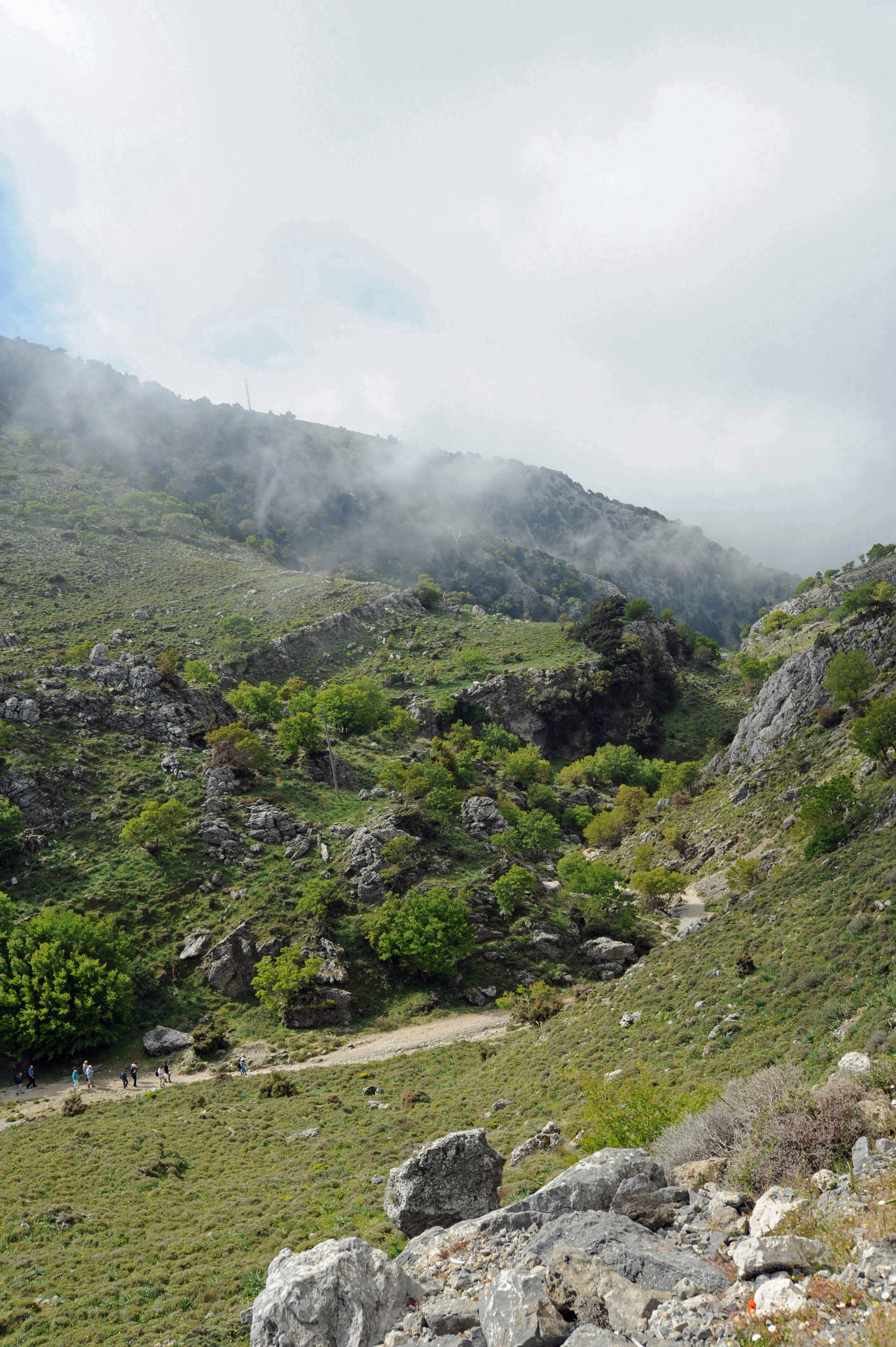 Sur la route de Vryssès à Chora Sfakion | De nos jours on peut facilement accéder aux Sfakia et à Chora Sfakion depuis le côte nord de l’île ; que l’on vienne de La Canée ou de Réthymnon par la route nationale 90, on peut bifurquer vers la route provinciale 54 reliant Vryssès à Chora Sfakion (Επαρχιακη Οδός Βρυσών – Χώρα Σφακίων) ; à environ 2 km au sud-est de Vryssès se trouve un échangeur routier avec une bretelle de sortie vers la route provinciale 54 ; si l’on voyage par l’ancienne route nationale 90, une bifurcation se trouve dans le même secteur. La route provinciale 54 est une bonne route qui se dirige presque plein sud, mais avec de nombreux virages, vers Chora Sfakion qui est, à peu près, à la même longitude que Vryssès, mais de l’autre côté des Montagnes Blanches ; le trajet depuis Vryssès est long de 37 km, soit environ 50 min de conduite, et environ 73 km depuis La Canée, soit 1 h 30 min de conduite. La route provinciale traverse d’abord la plaine de l’Apokoronas, à une cinquantaine de mètres d’altitude, puis elle escalade le versant nord du massif des Montagnes Blanches, jusqu’au plateau de Krapi (οροπέδιο της Κράπης). Après le plateau de Krapi, la route contourne, par l’est, un long promontoire qui marque la bordure entre le dème de l’Apokoronas et le dème des Sfakia, à 580 m d’altitude. La route provinciale continue de monter jusqu’à un col, situé au lieu-dit Xylodema (Ξυλόδεμα), un des deux points culminants de la route, à environ 800 m d’altitude, qui offre une magnifique vue sur le plateau d’Askyfou, qui se trouve en contrebas, à environ 730 m d’altitude.