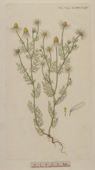 | Étymologie latine | | Matricaria : du latin « matrix », matrice, allusion aux vertus emménagogues de cette plante. Dioscoride et Galien la préconisaient pour les troubles féminins. chamomilla : du grec khamaimêlon, pomme rampante, se réfère au fait que la plante pousse près du sol (chamos) et à l’odeur agréable de pomme (melos) verte de ses feuilles. |