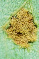 | On constate parfois en plein été un brunissement inquiétant du feuillage des tilleuls, en ville en particulier ; il s’agit des dommages spectaculaires des larves d’un Hyménoptère, la Tenthrède limace (Caliroa annulipes) une petite espèce de couleur noire, dont la larve jaunâtre clair, de 10 mm de longueur, à tégument recouvert d’une substance de consistance gélatineuse, se nourrit en décapant la face supérieure des feuilles comme par l’action d’une râpe. Deux générations peuvent se succéder durant l’été. Les larves passent l’hiver dans des cocons tissés dans le sol.Face inférieure d’une feuille de tilleul décapée par les larves de la Tenthrède (Caliroa annulipes). On aperçoit les amas de déjections noirâtres. |
